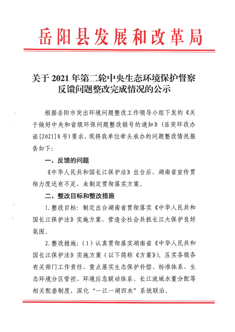 关于2021年第二轮中央生态环境保护督察反馈问题整改完成情况的公示