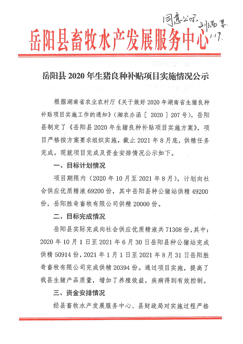 岳阳县2020年生猪良种补贴项目实施情况公示