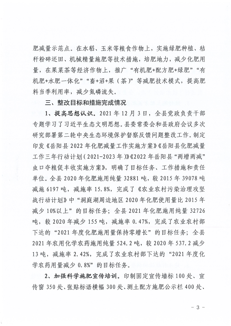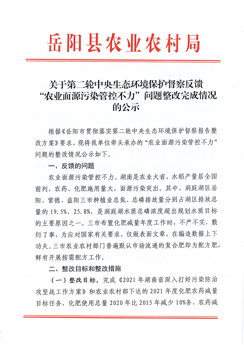 关于第二轮中央生态环境保护督察反馈“农业面源污染管控不力”问题整改完成情况的公示