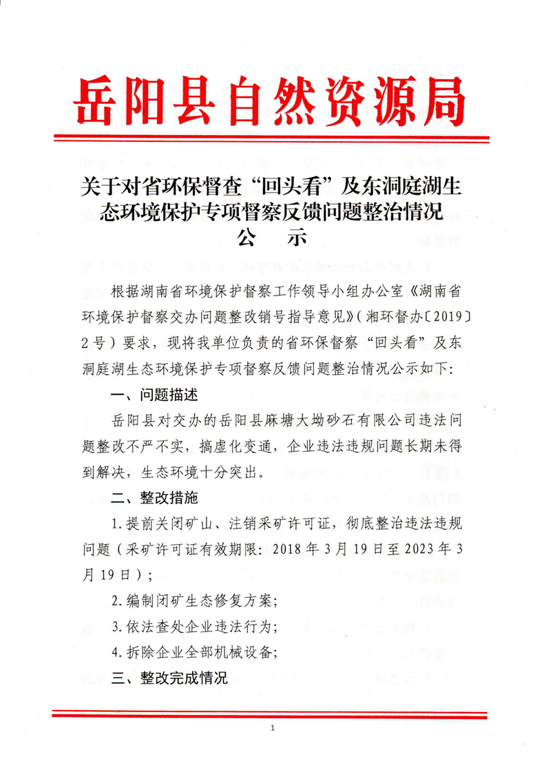 关于对省环保督查“回头看”及东洞庭湖生态环境保护专项督察反馈问题整治情况