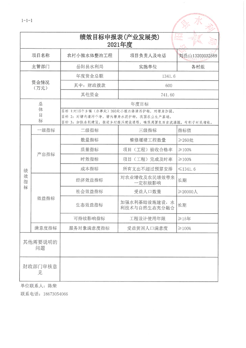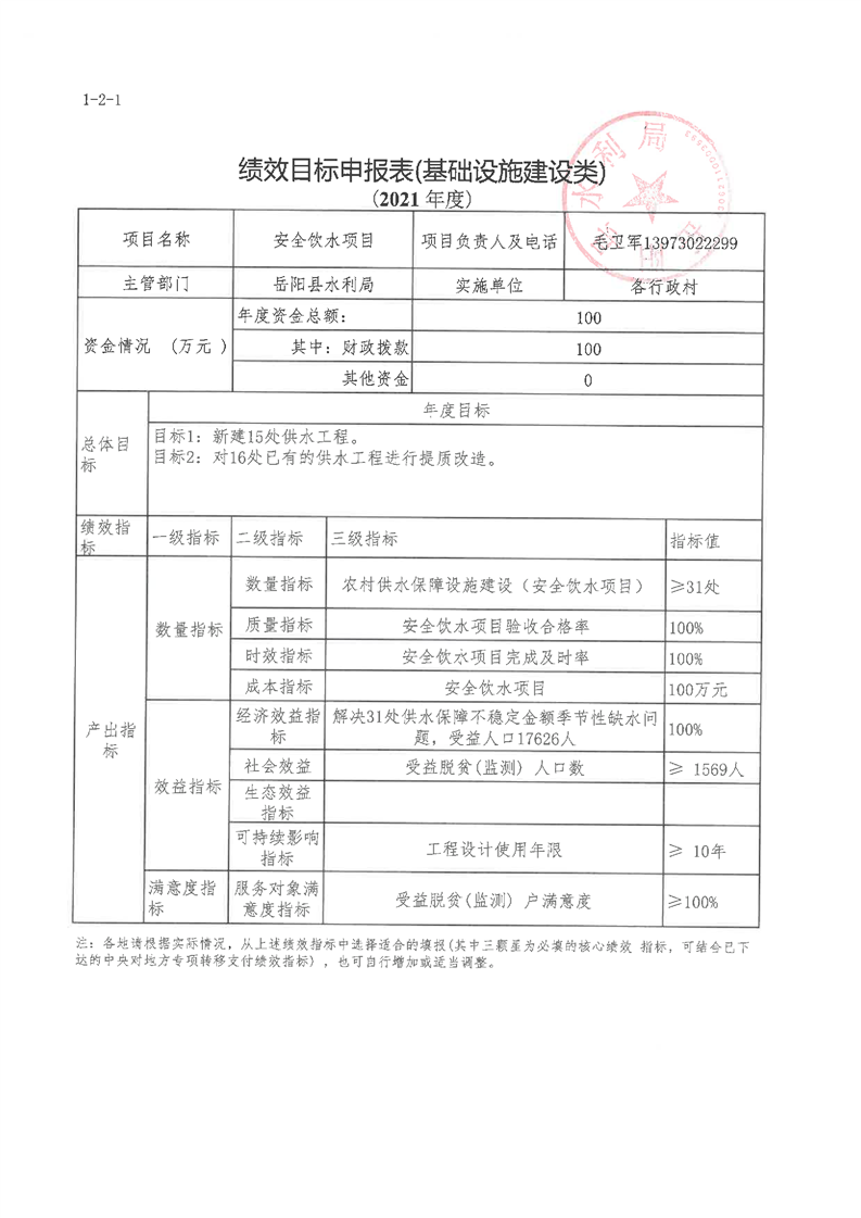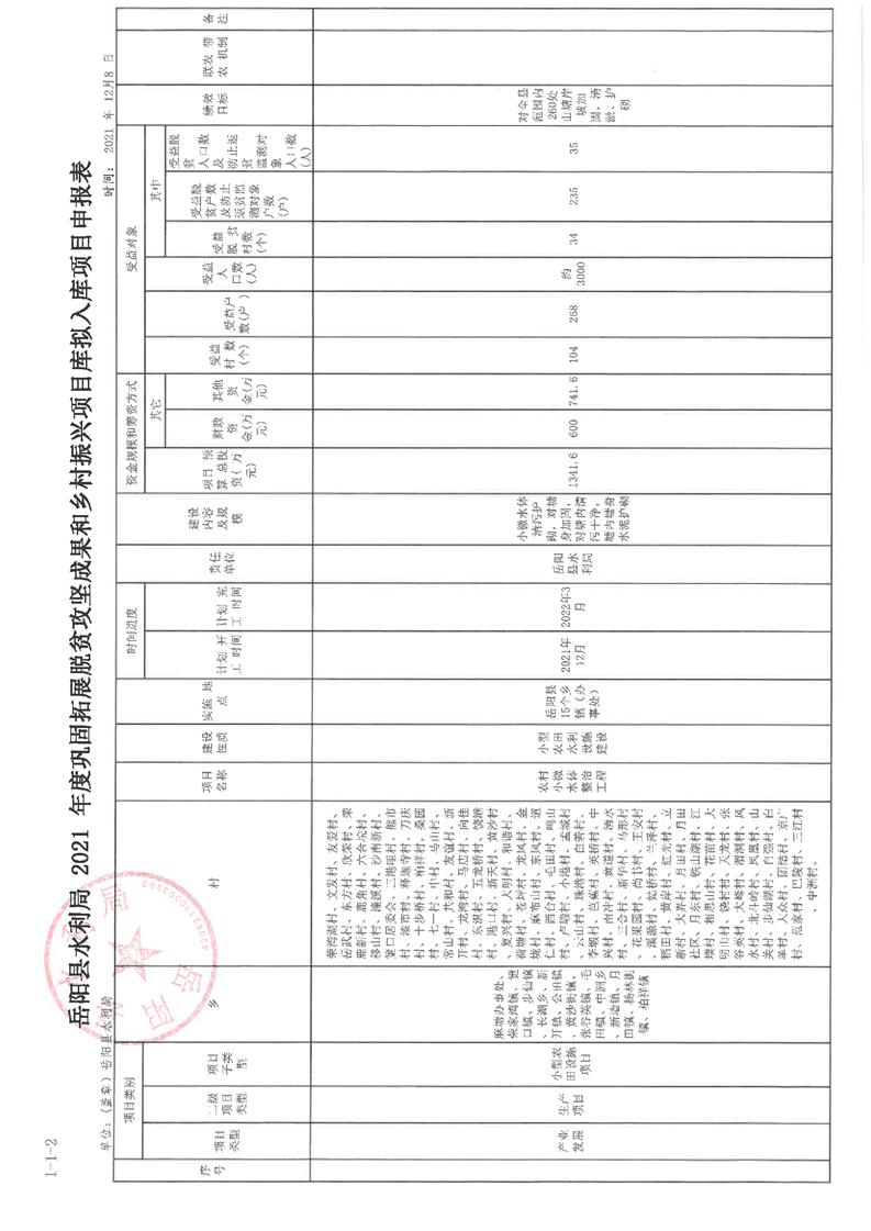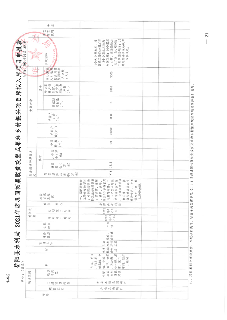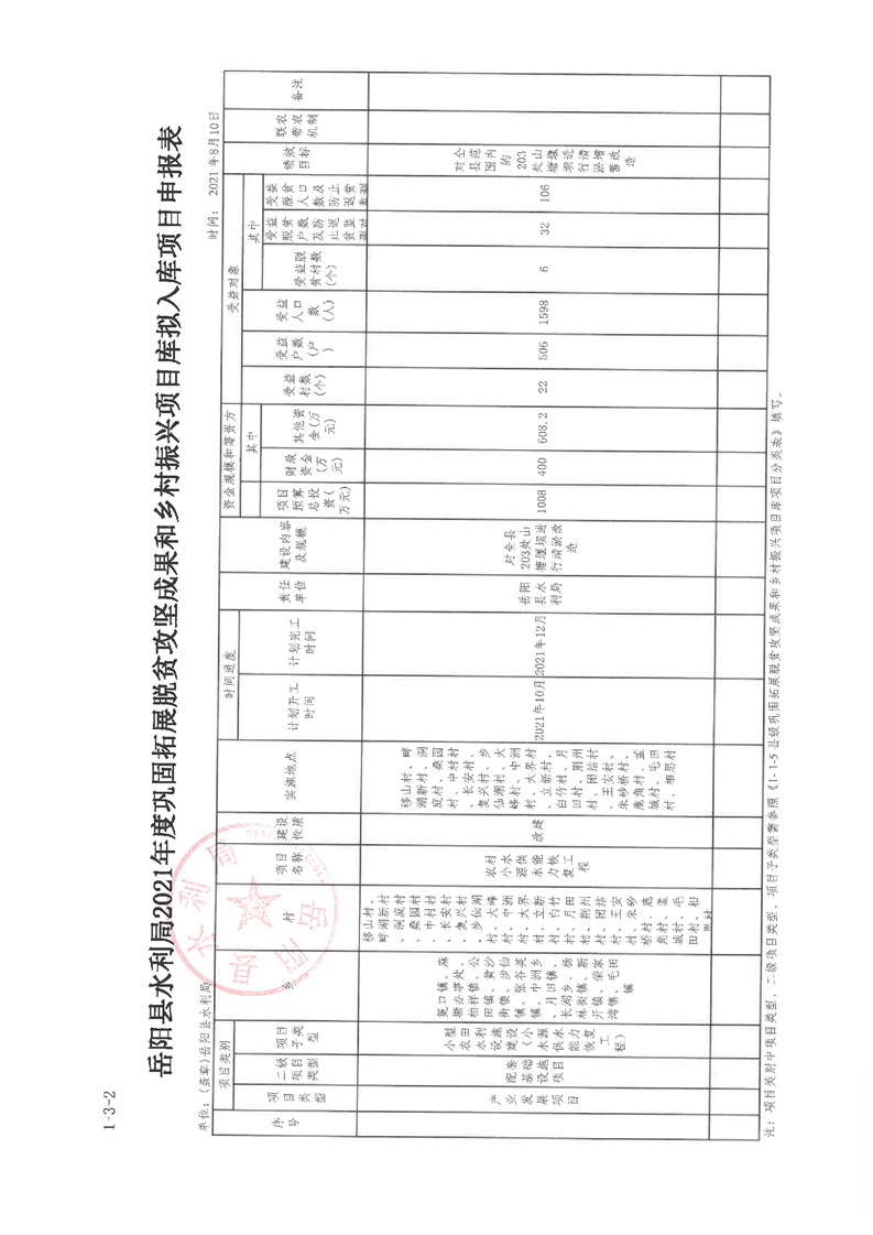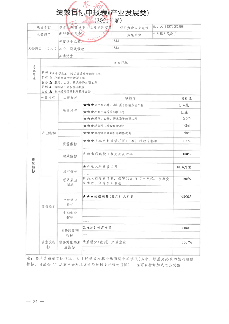 岳阳县水利局2021年乡村振兴衔接资金项目入库申报表及绩效目标申报表