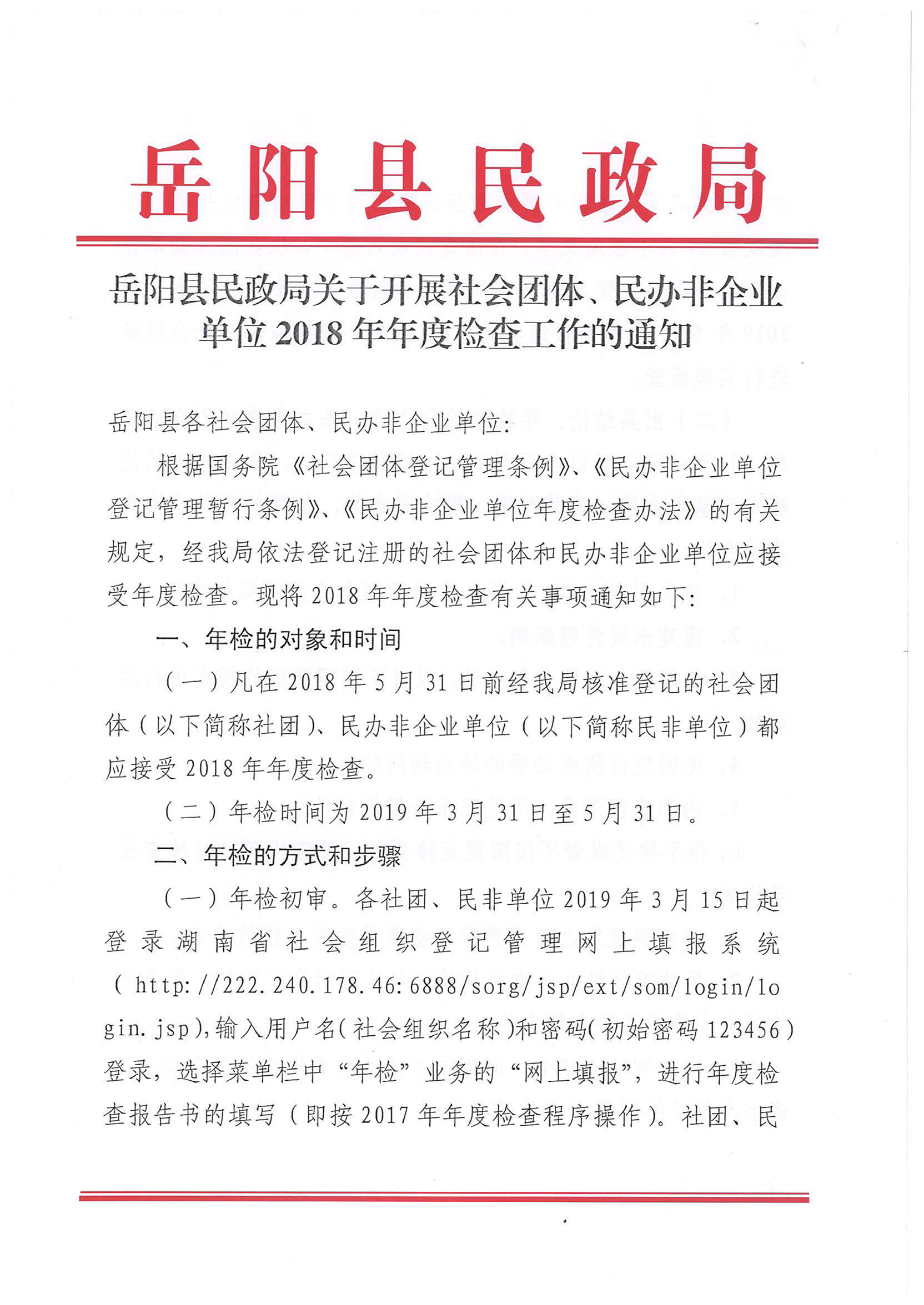 岳阳县民政局关于开展社会团体、民办非企业单位2018年年度检查工作的通知