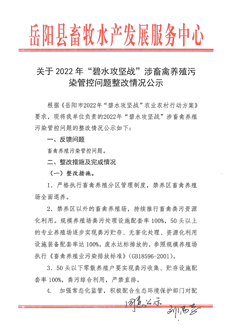 关于2022年“碧水攻坚战”涉畜禽养殖污染管控问题整改情况公示