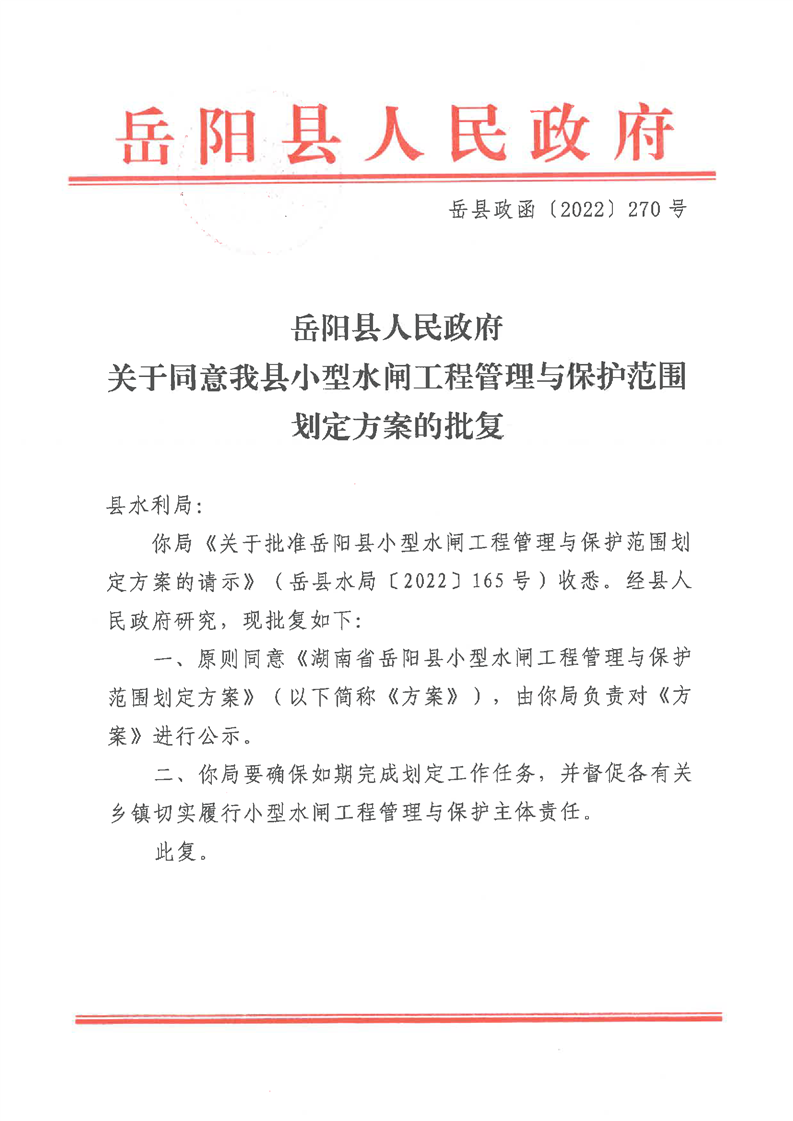 岳阳县人民政府关于同意我县小型水闸工程管理与保护范围划定方案的批复(岳县政函[2022]270号)
