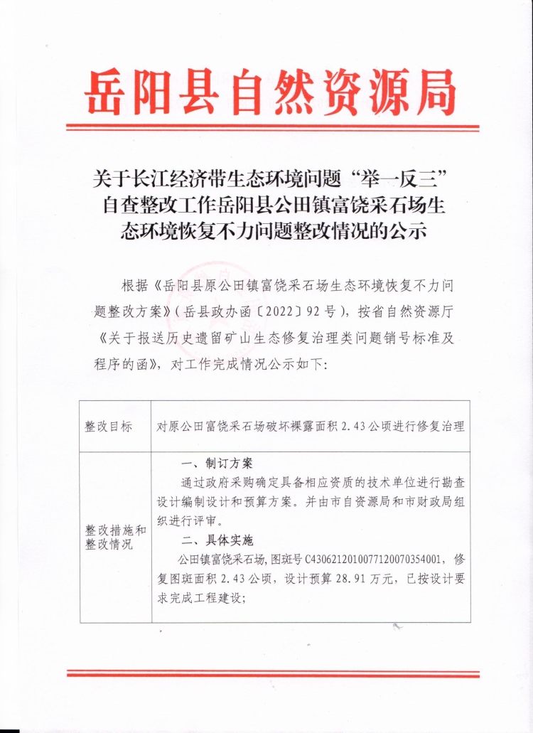 关于长江经济带生态环境问题“举一反三”自查整改工作岳阳县公田镇富饶采石场生态环境恢复不力问题整改情况的公示