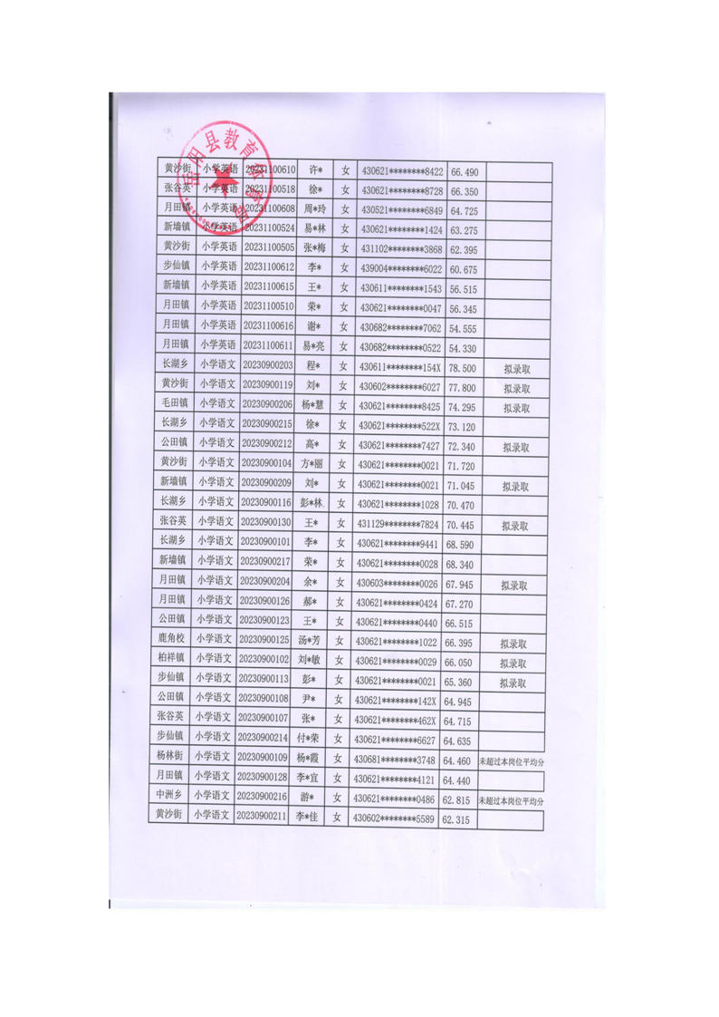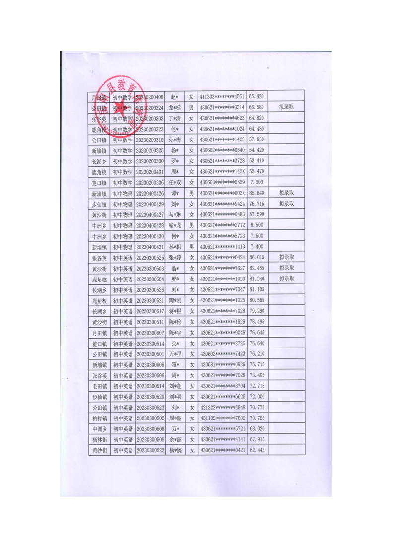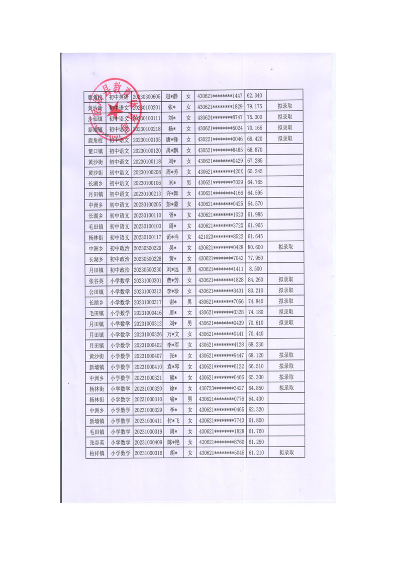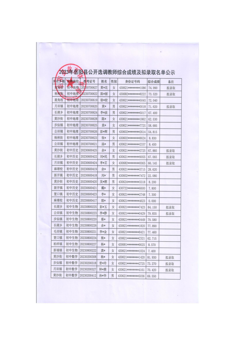 2023年岳阳县公开选调教师综合成绩经岳阳县公开选调教师工作领导小组审定,现予以公示,公示期为5 个工作日。