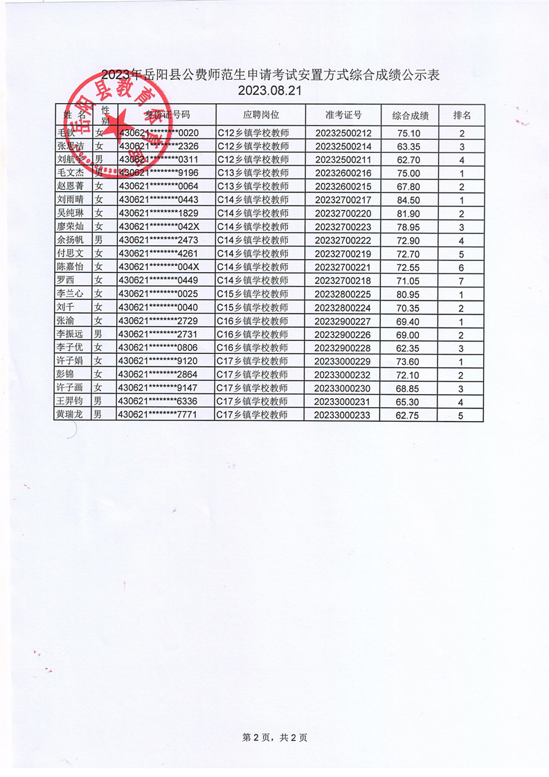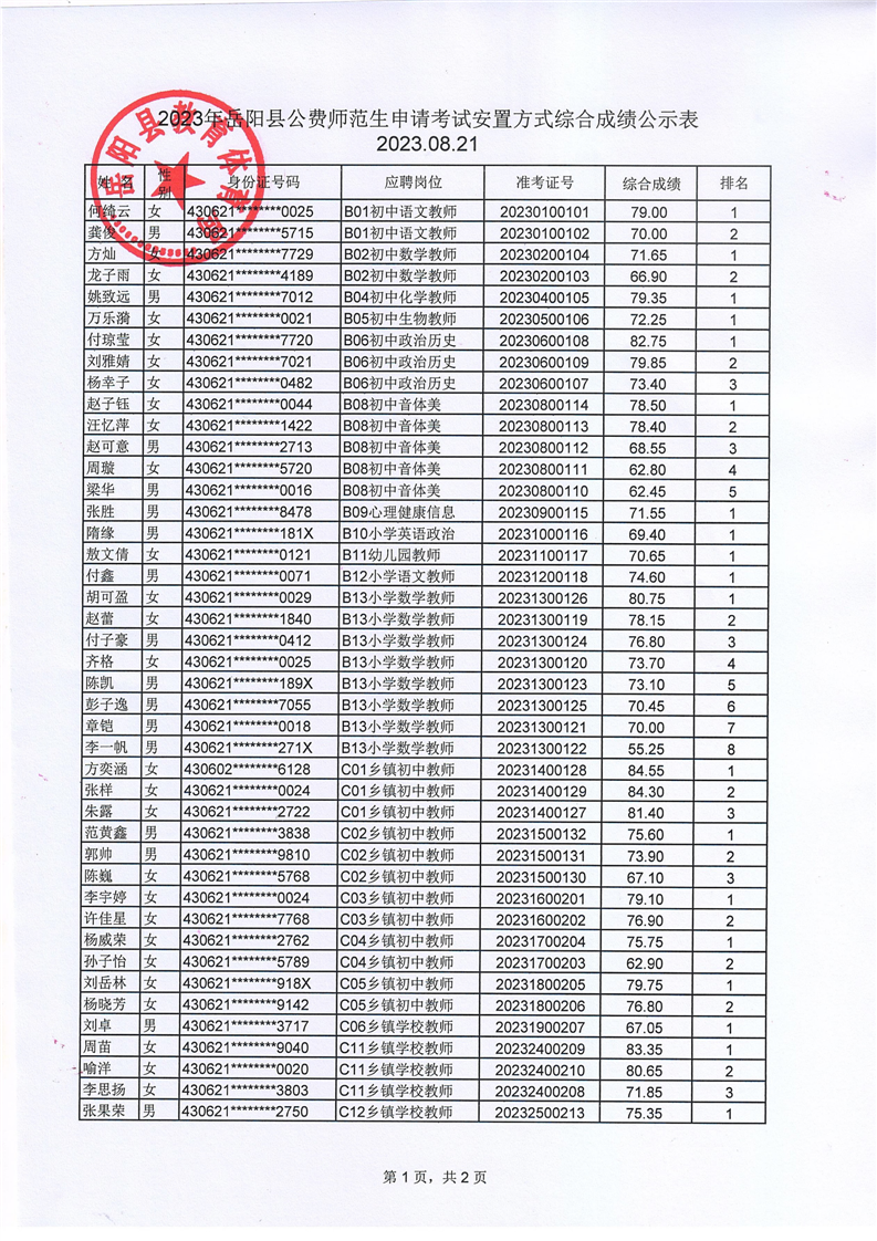 我县2023年共有65名农村教师公费定向培养师范毕业生申请参加考试安置,经过笔试和考核附加评分,现将综合成绩予以公示,公示期为3个工作日。公示结束后,考生可在两日内书面申请复查本人成绩,过期不予受理。