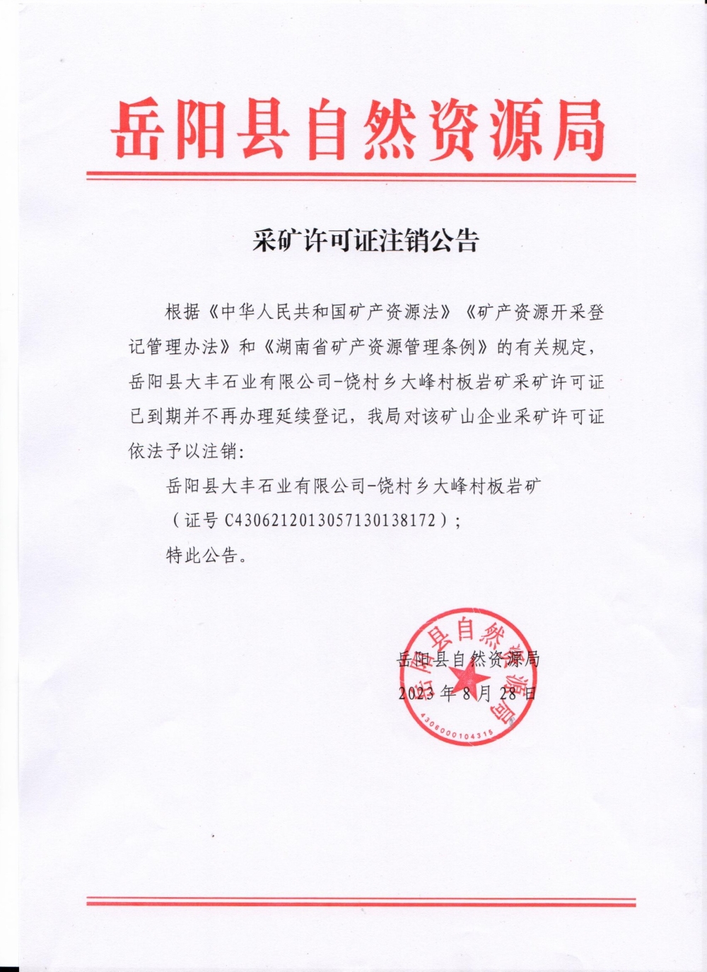 岳阳县大丰石业有限公司-饶村乡大峰村板岩矿采矿许可证注销公告