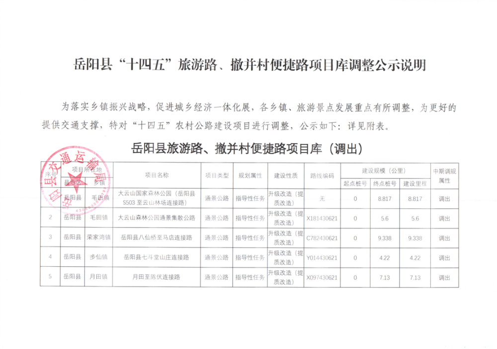 岳阳县“十四五”旅游路、撤并村便捷路项目库调整公示说明