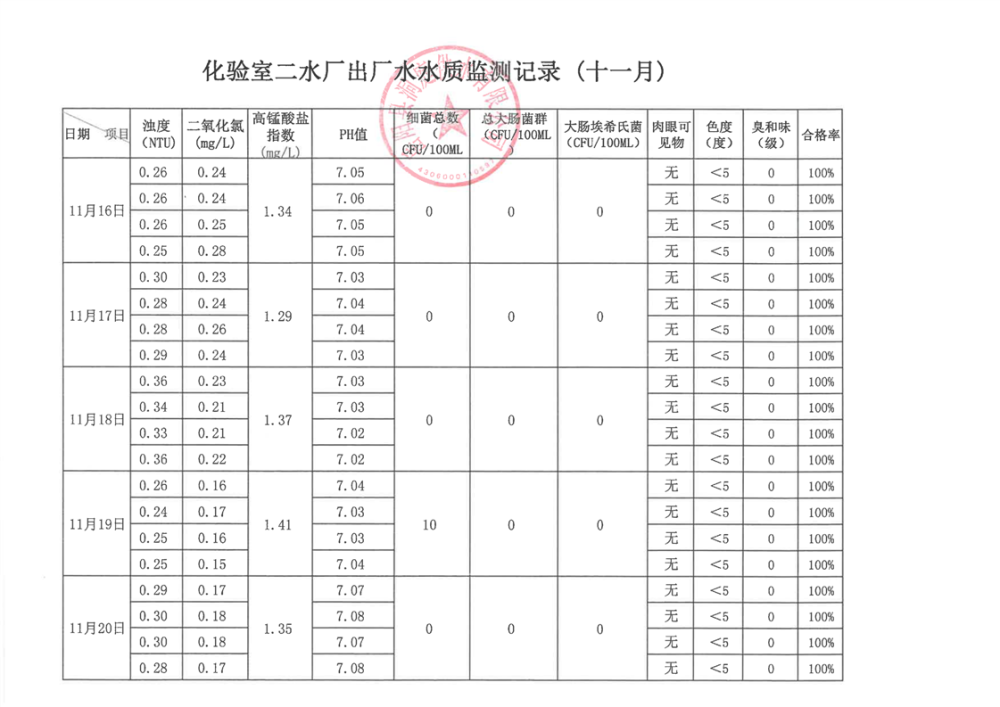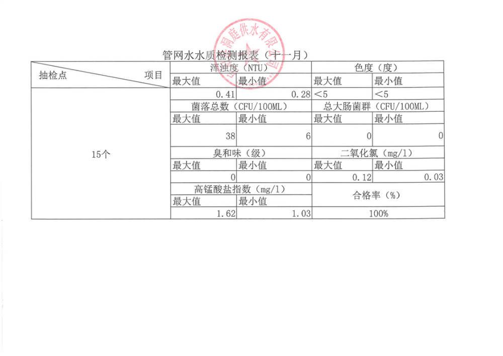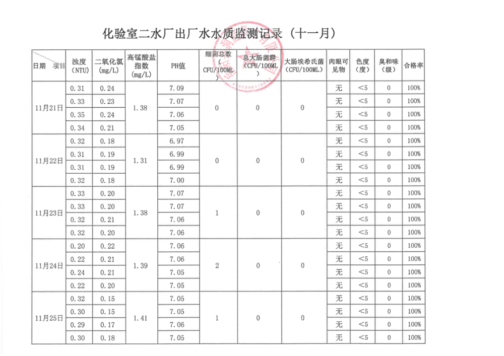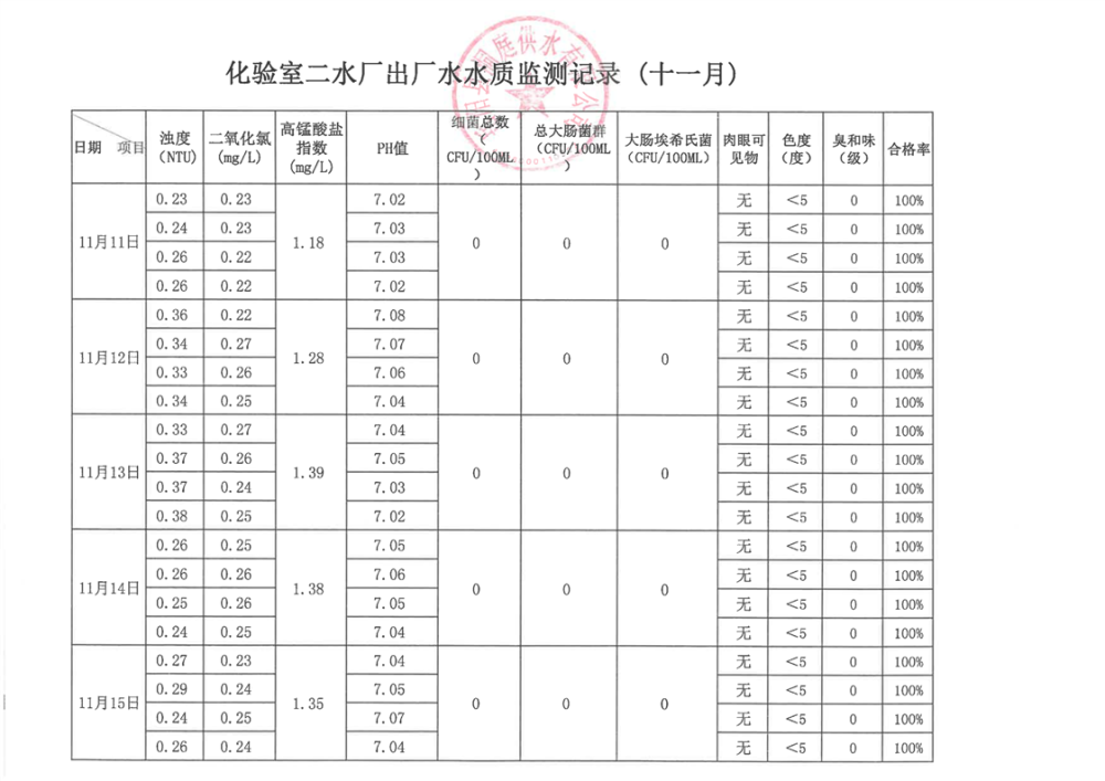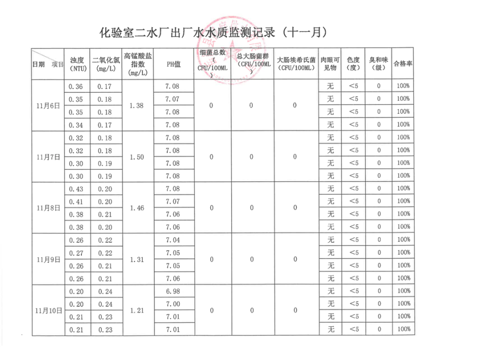 岳阳县洞庭供水有限公司水质检测信息公开(十一月)