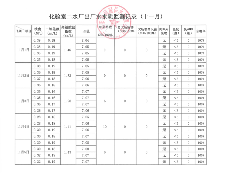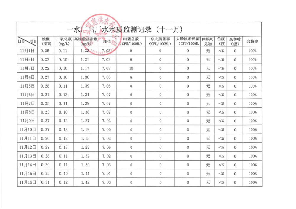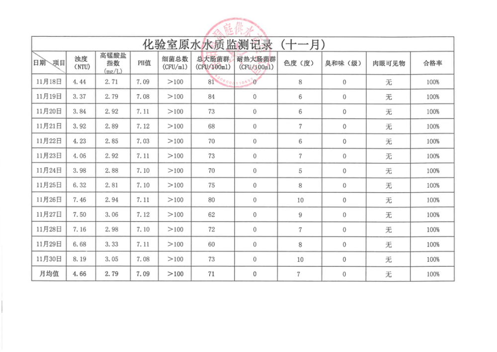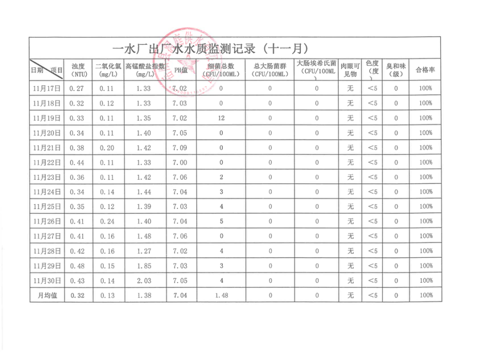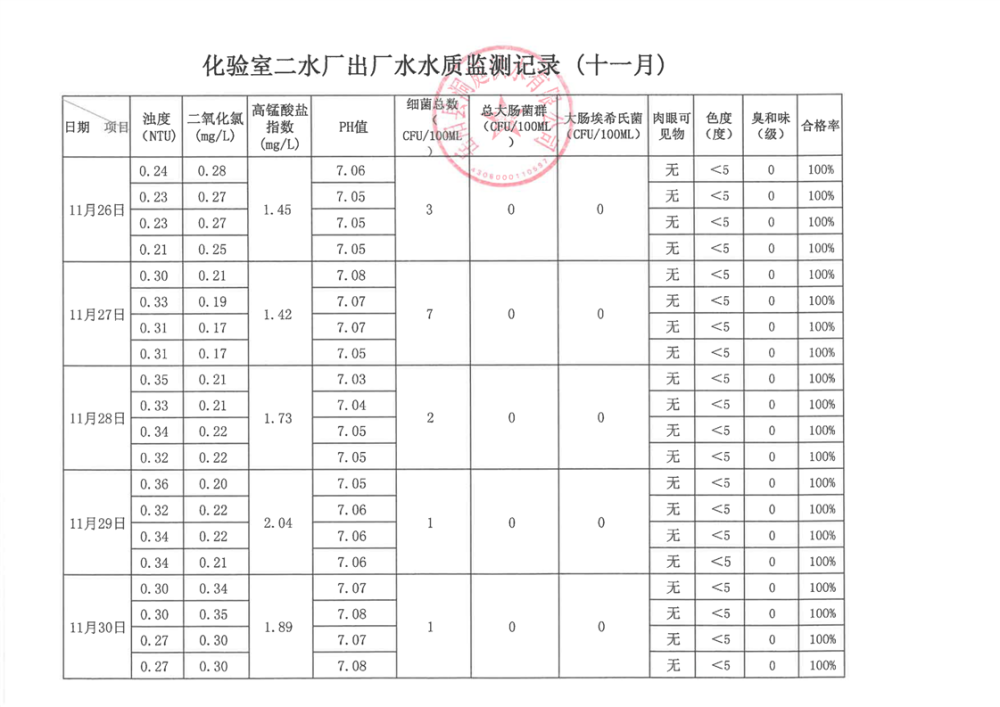 岳阳县洞庭供水有限公司水质检测信息公开(十一月)