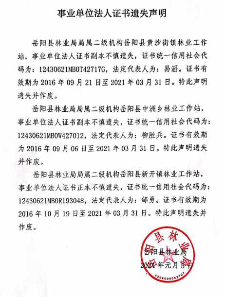 岳阳县黄沙街镇林业工作站、中洲乡林业工作站、新开镇林业工作站法人登记证遗失声明