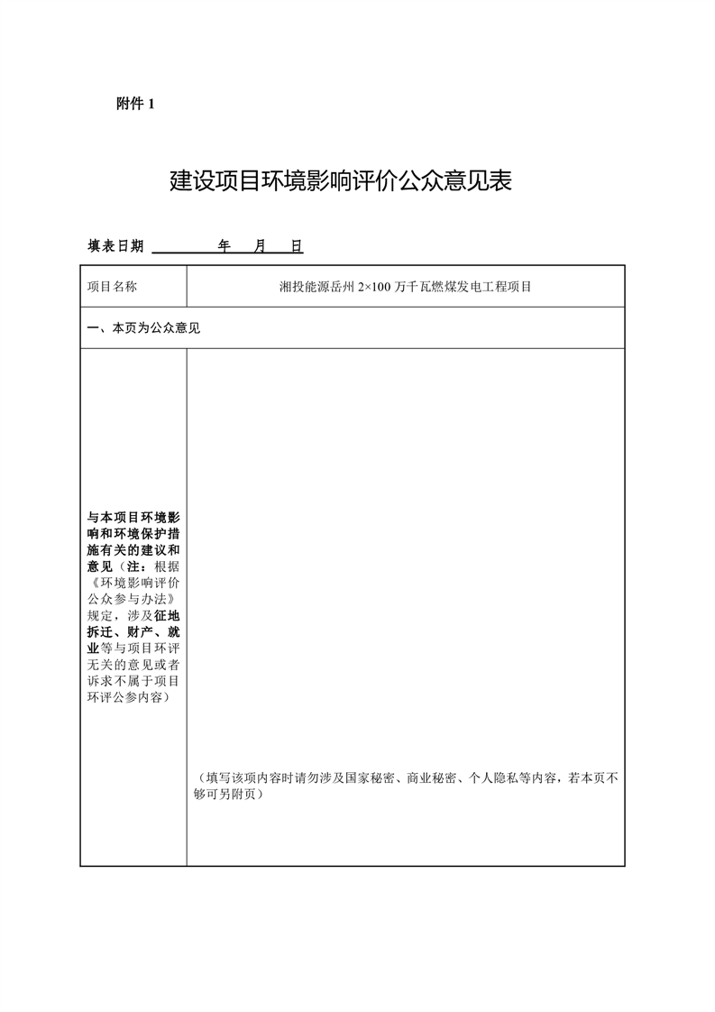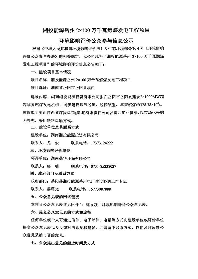 湘投能源岳州2x100万千瓦燃煤发电工程项目环境影响评价公众参与信息公示