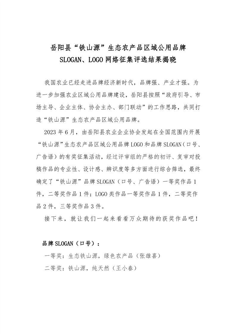 岳阳县“铁山源”生态农产品区域公用品牌 SLOGAN、LOGO网络征集评选结果揭晓
