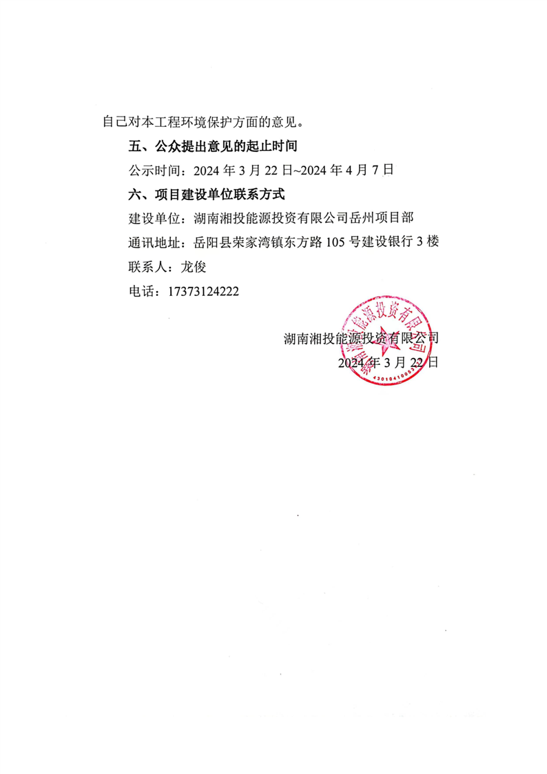 湘投能源岳州2×100万千瓦燃煤发电工程环评第二次信息公示