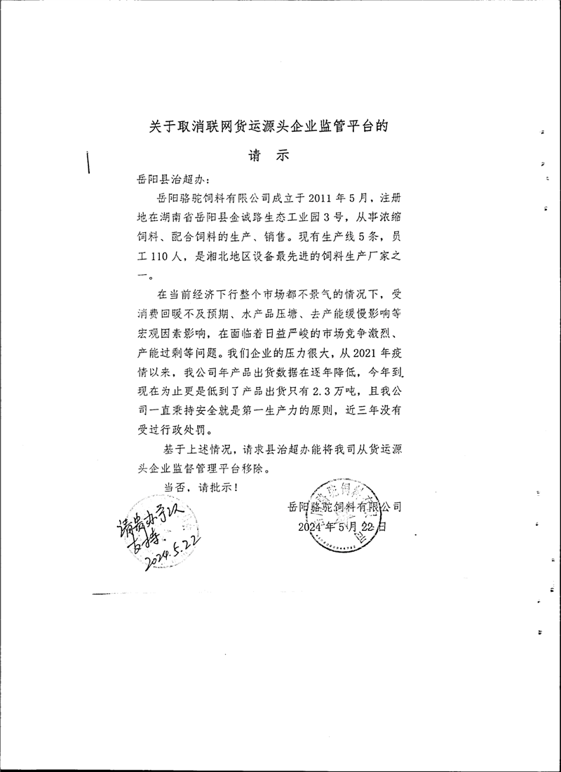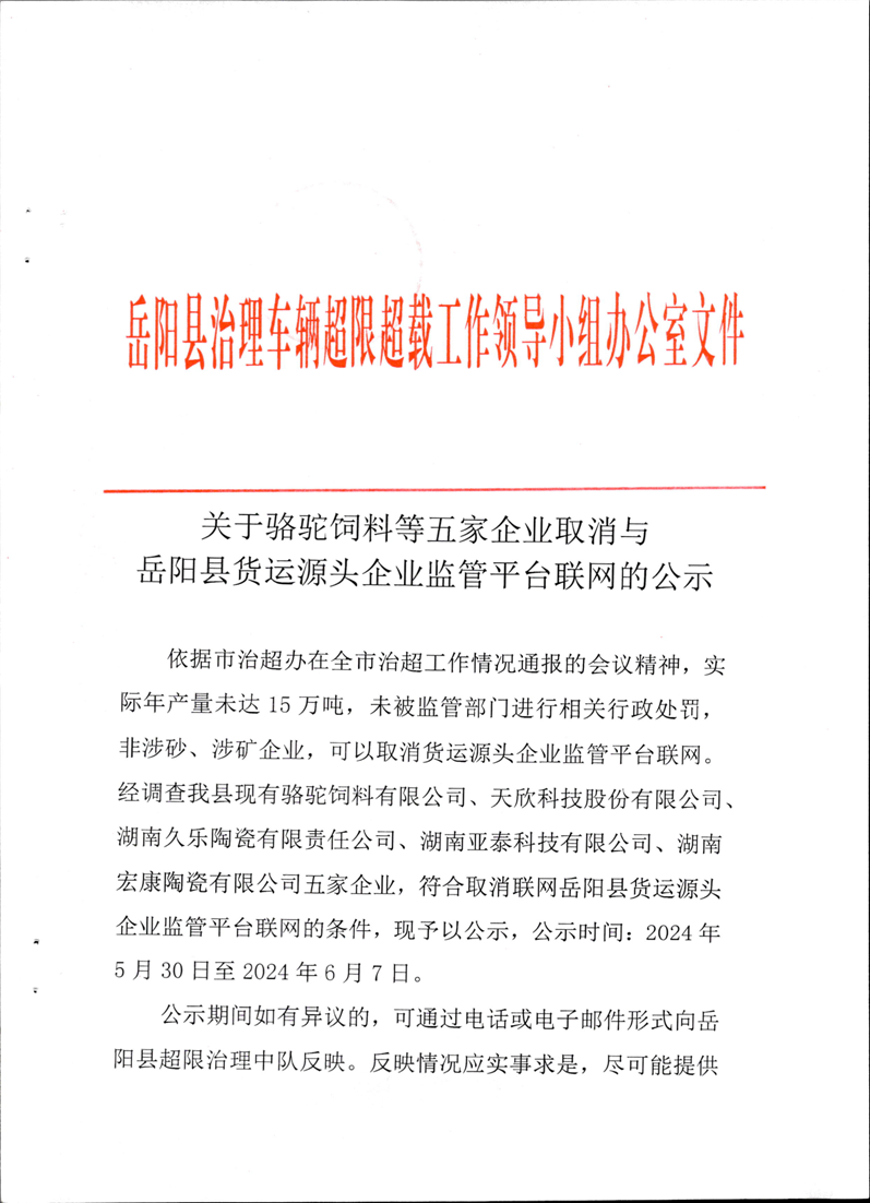 关于骆驼饲料等五家企业取消与岳阳县货运源头企业监管平台联网的公示