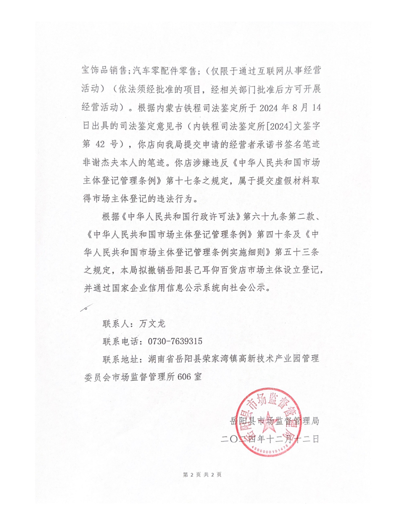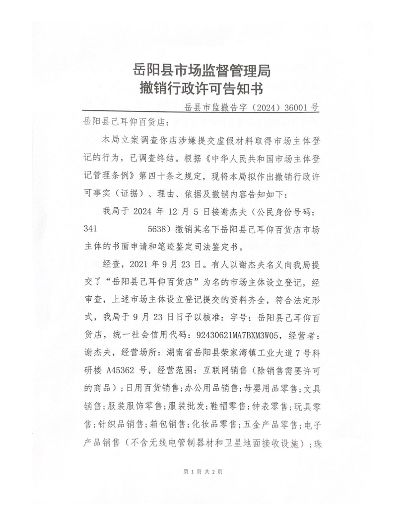 岳阳县市场监督管理局撤销行政许可告知书