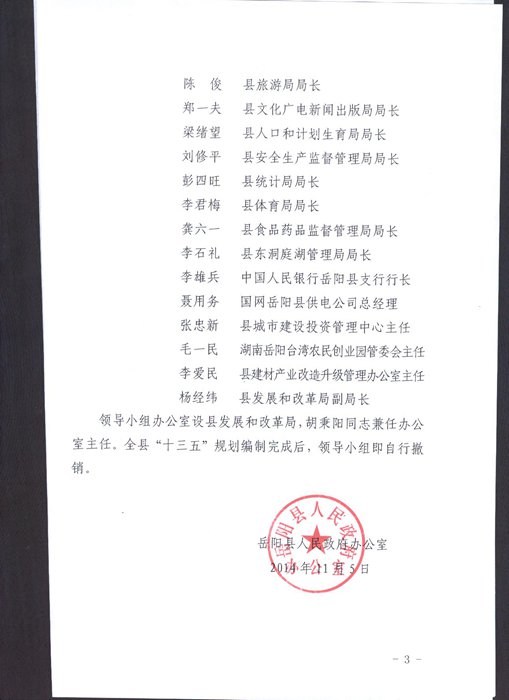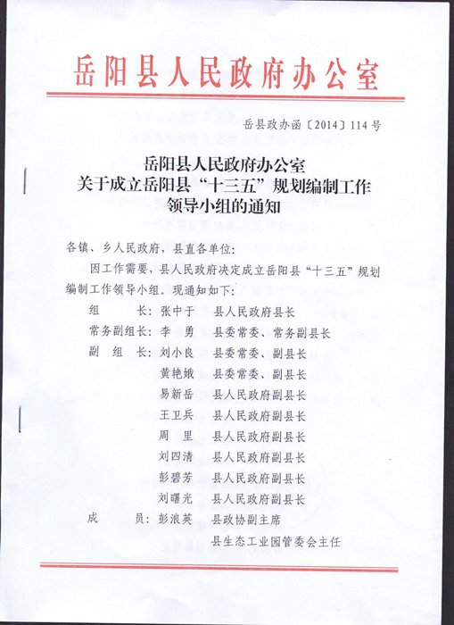 岳阳县人民政府办公室关于成立岳阳县“十三五”规划编制工作领导小组的通知