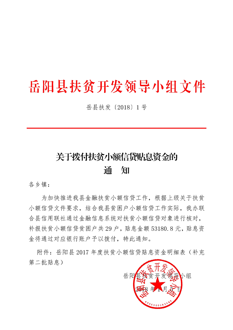岳县扶发【2018】1号——关于拨付扶贫小额信贷贴息资金的通知