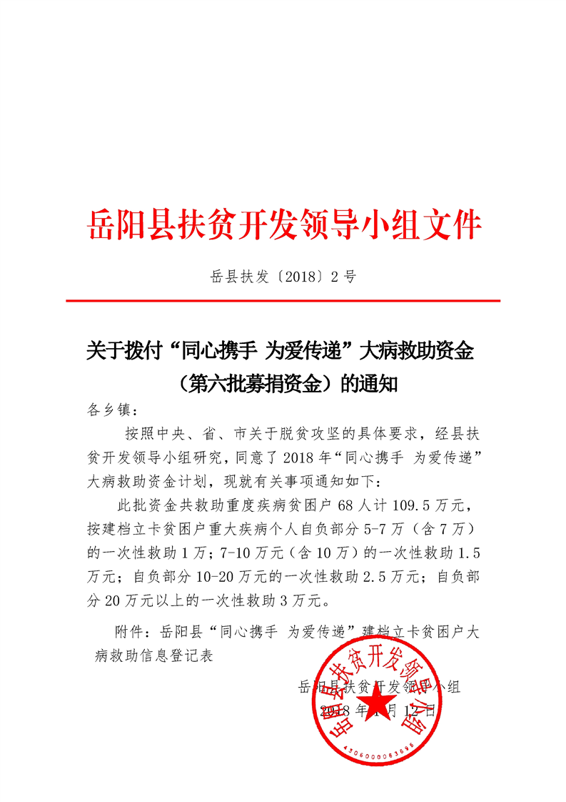 岳县扶发【2018】2号——关于拨付“同心携手 为爱传递”大病救助资金(第六批募捐资金)的通知