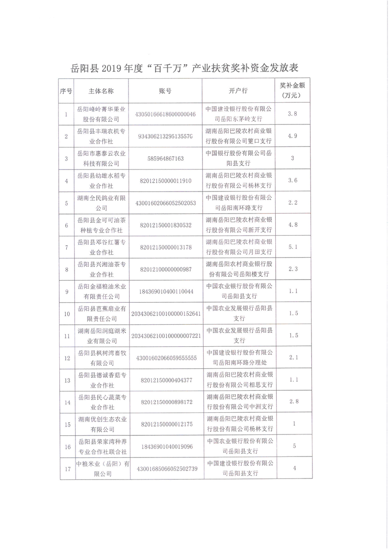 岳阳县下达2019年度产业扶贫百千万奖补资金公开公示