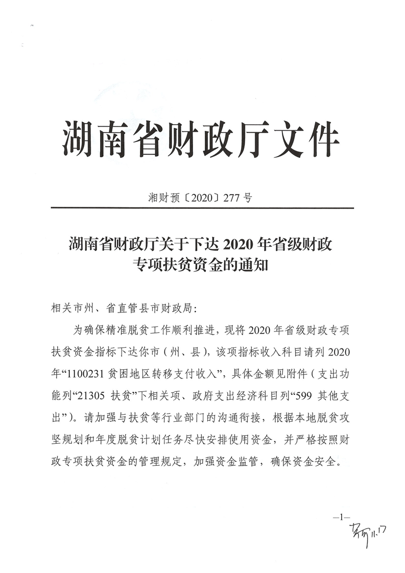 湖南省财政厅关于下达2020年省级财政专项扶贫资金的公开公示