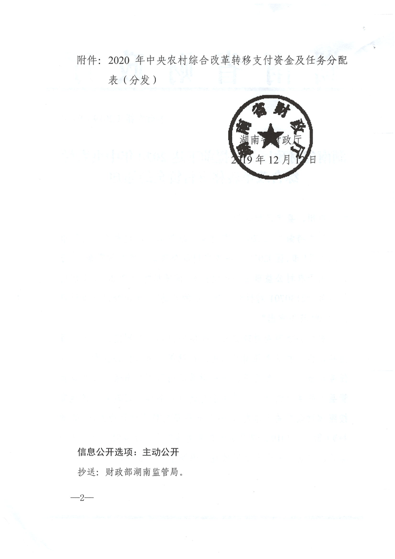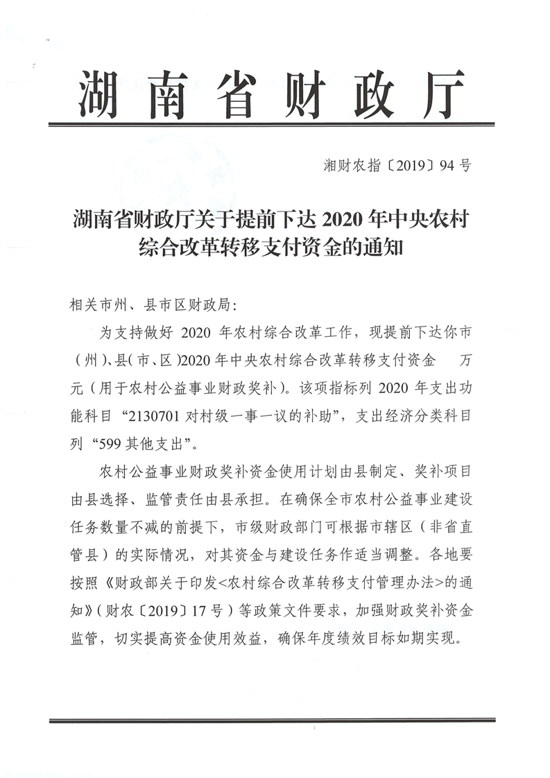 省财政厅提前下达2020年中央农村综合改革转移支付资金公开