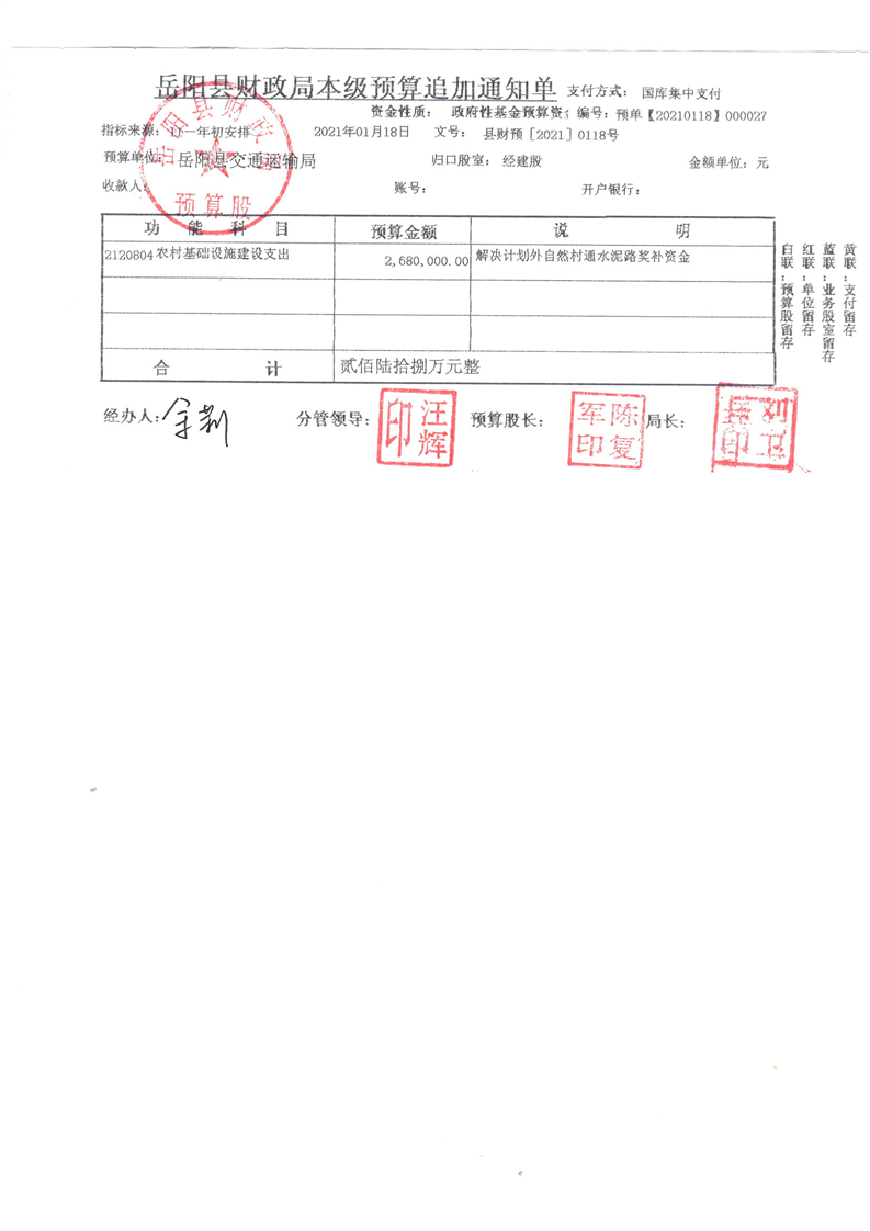 岳阳县下达计划处自然村通水泥路奖补资金公开公示