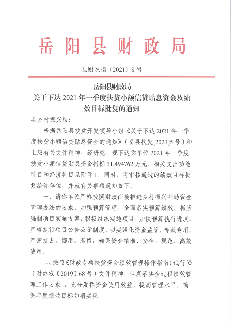 岳阳县财政局下达2021年一季度扶贫小额信贷贴息资金及绩效目标批复的公开公示