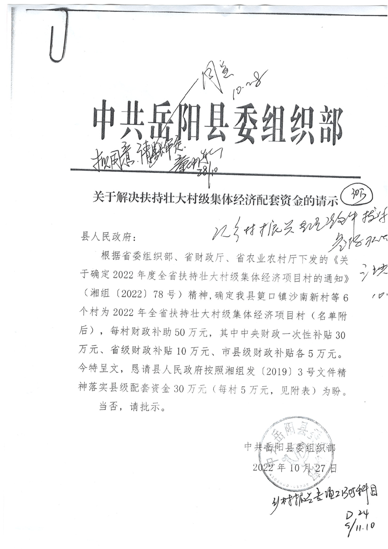 关于解决扶持壮大村级集体经济配套资金的请示、资金拨付单