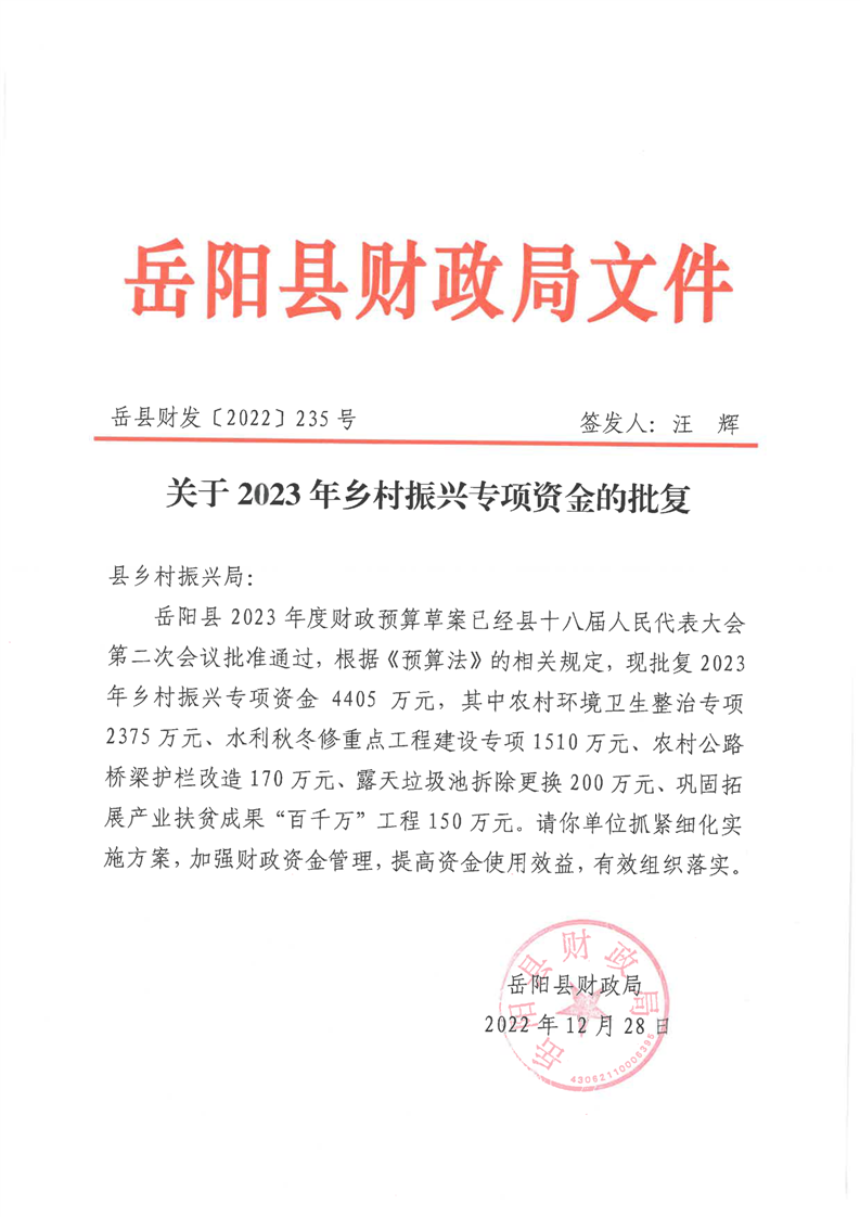 岳阳县财政局:关于2023年乡村振兴专项资金的批复