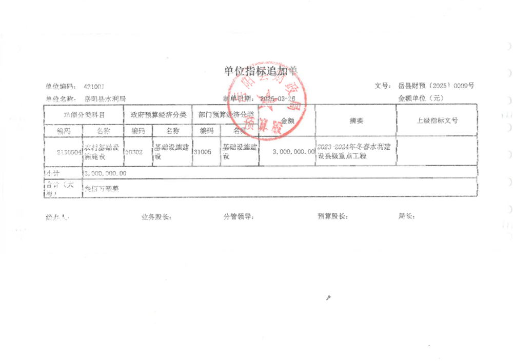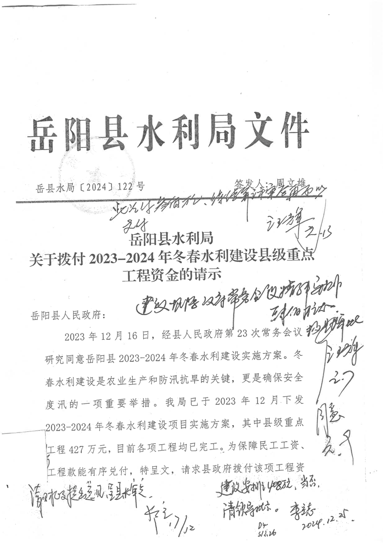 关于拨付2023-2024年冬春水利建设县级重点工程资金的请示