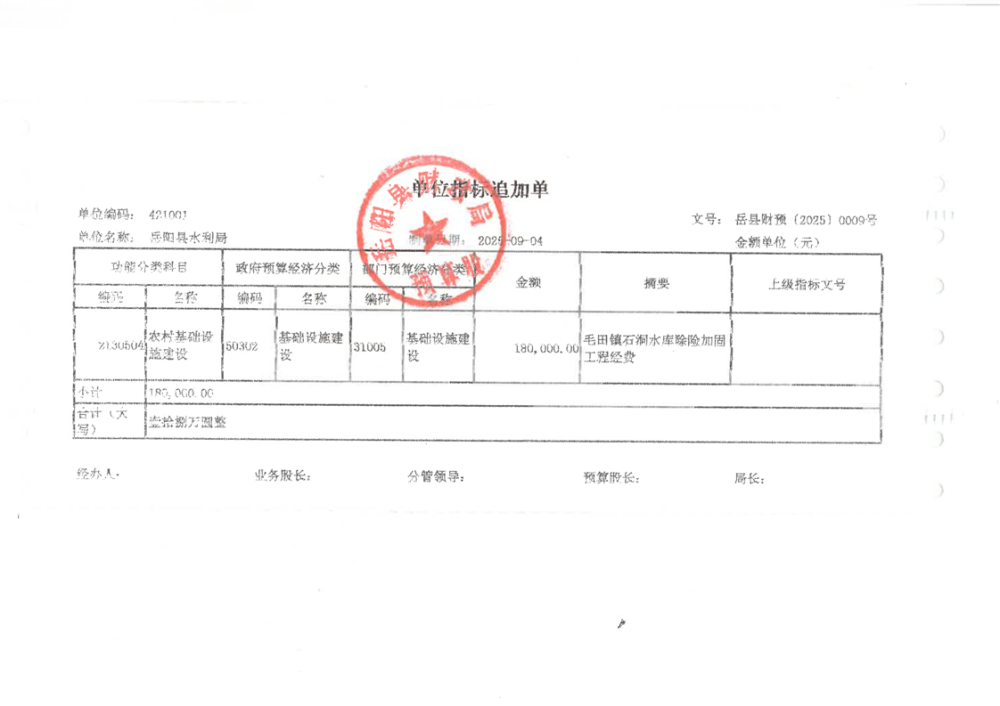 关于拨付岳阳县毛田镇石洞水库除险加固工程尾款的请示