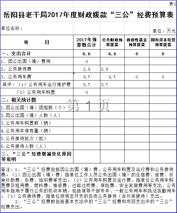 岳阳县老干局2017年度财政拨款“三公”经费预算表