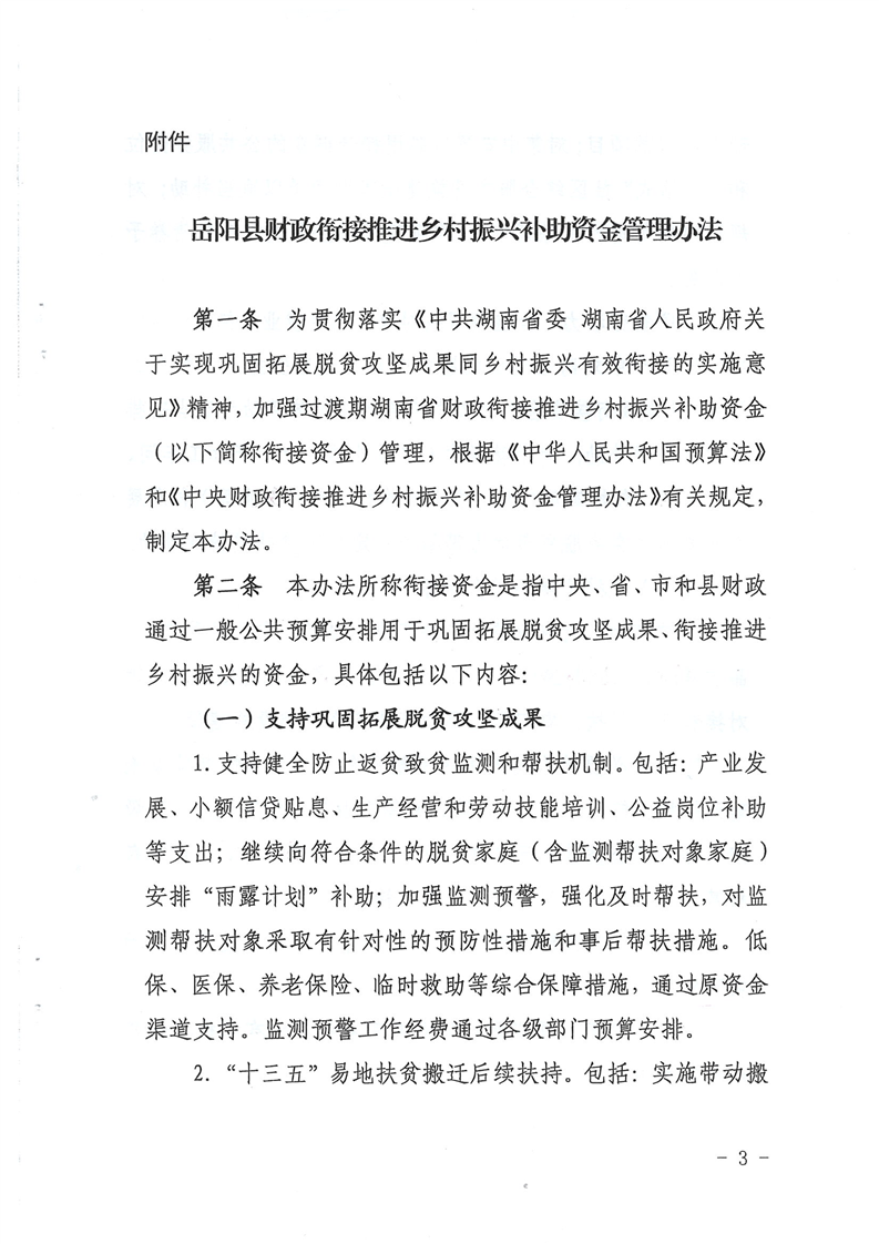 关于印发《岳阳县财政衔接推进乡村振兴补助资金管理办法》的通知公开公示