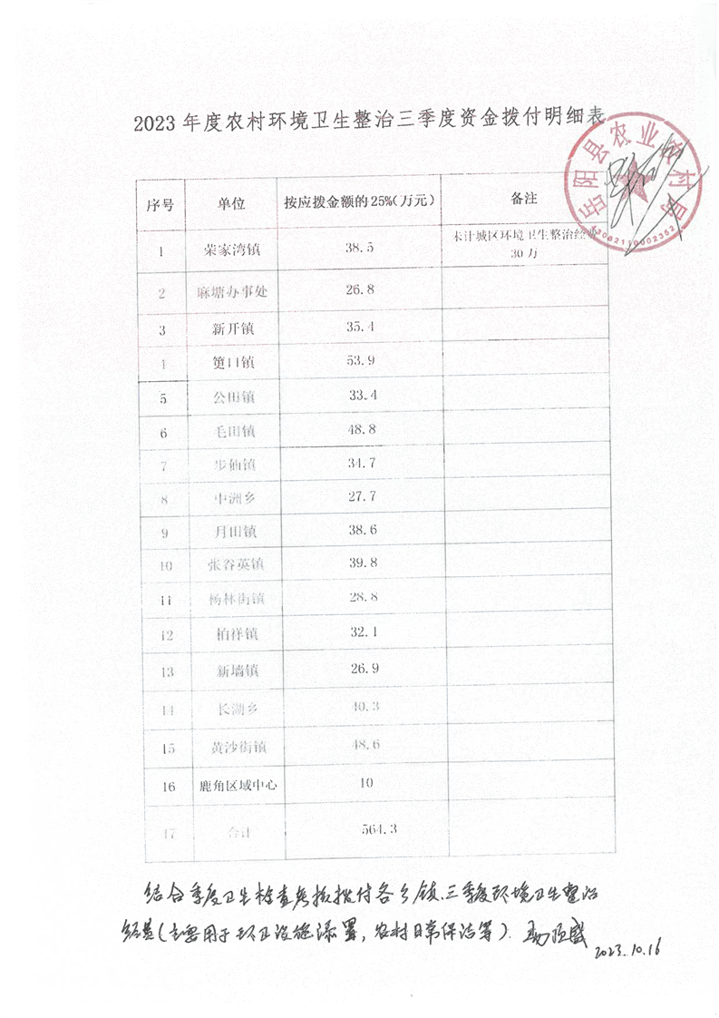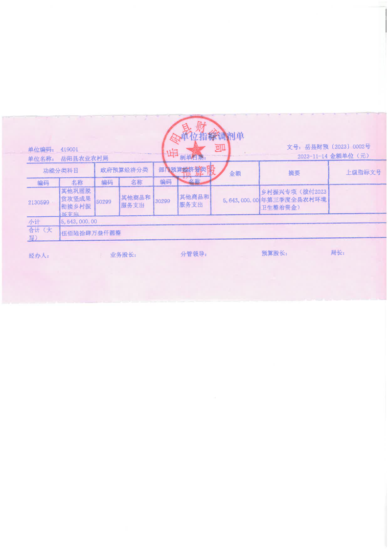 岳阳县本级财政乡村振兴专项(2023年第三季度全县农村环境卫生整治资金)