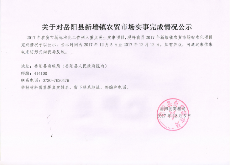 关于对岳阳县新墙农贸市场实事完成情况公示