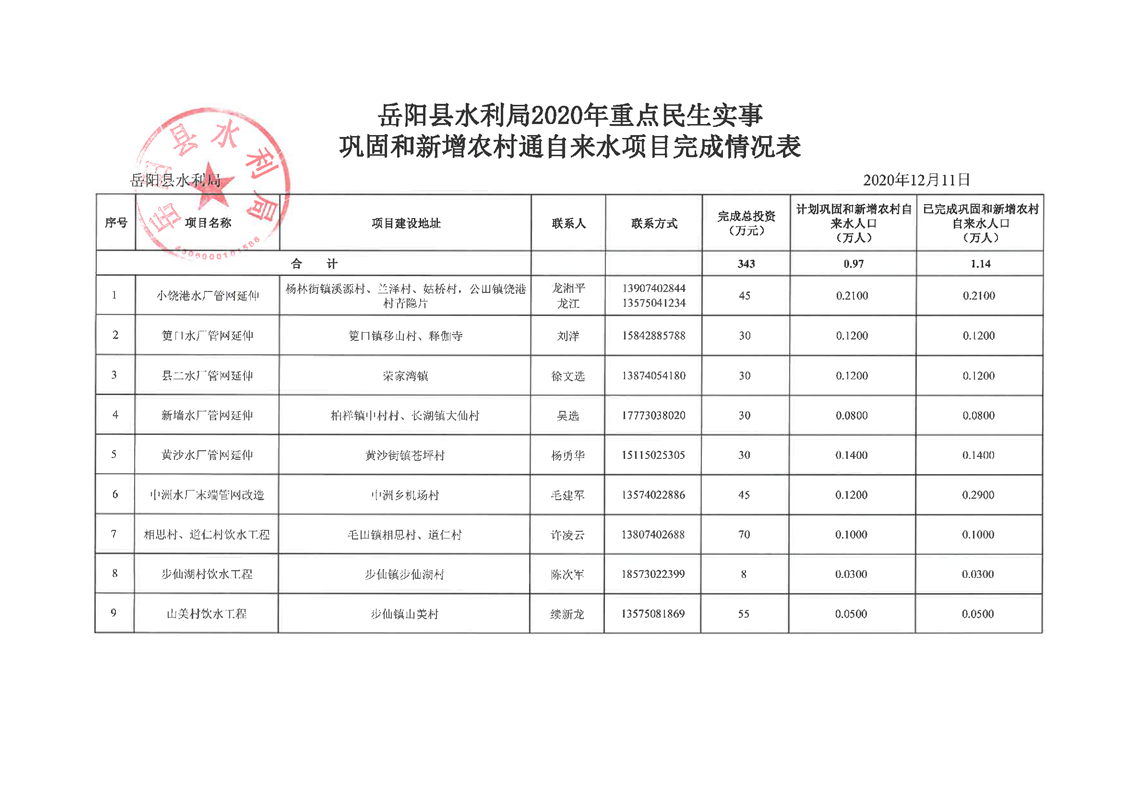 岳阳县水利局2020年重点民生实事巩固和新增农村通自来水项目完成情况