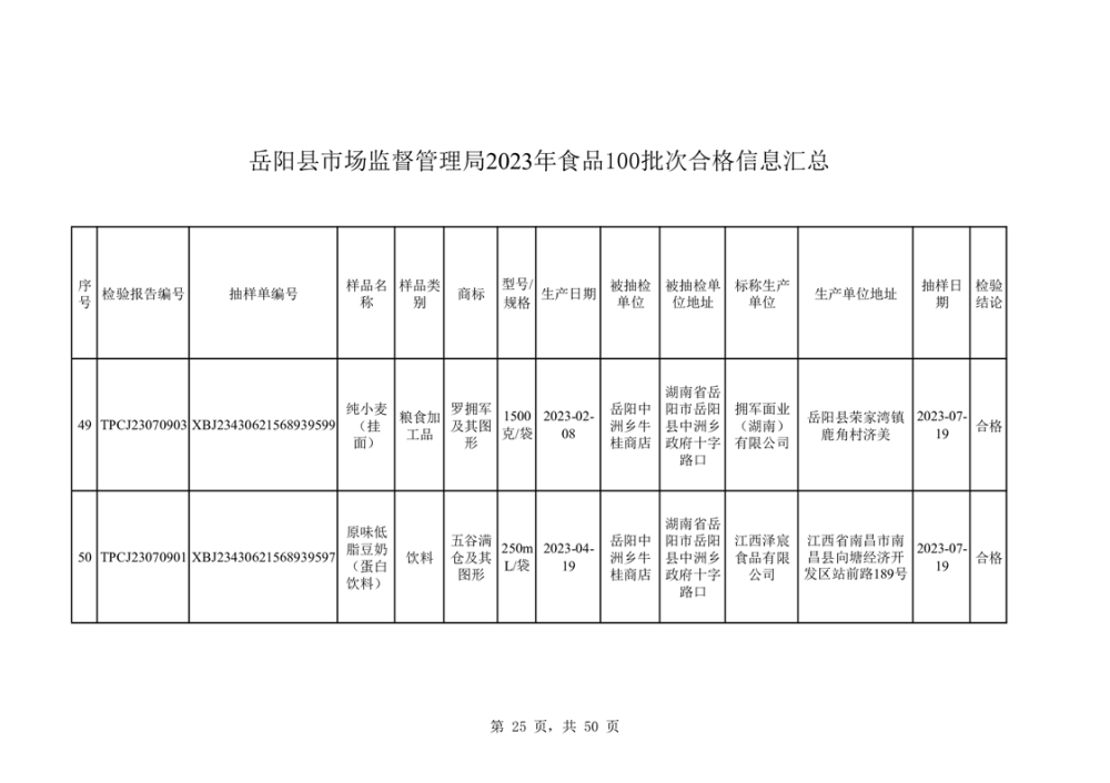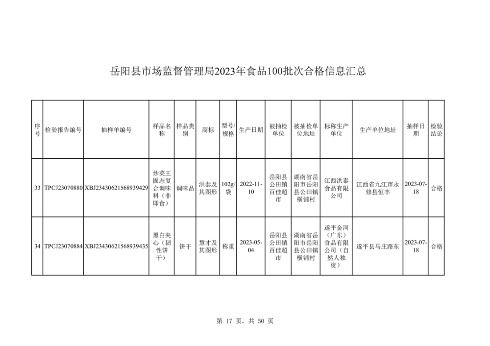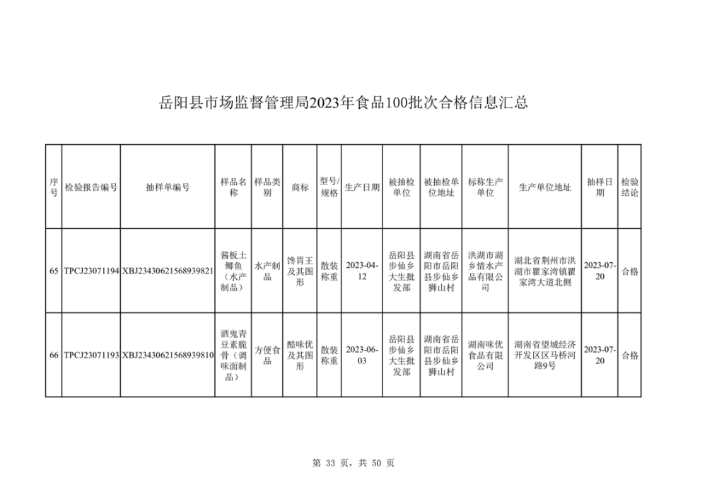 2023年岳阳县市场监督管理局食品合格信息汇总(100批次)