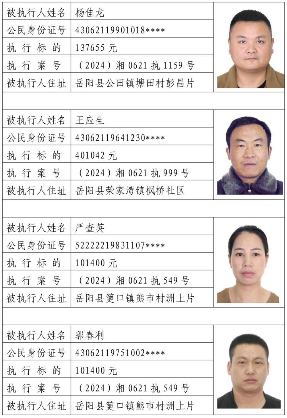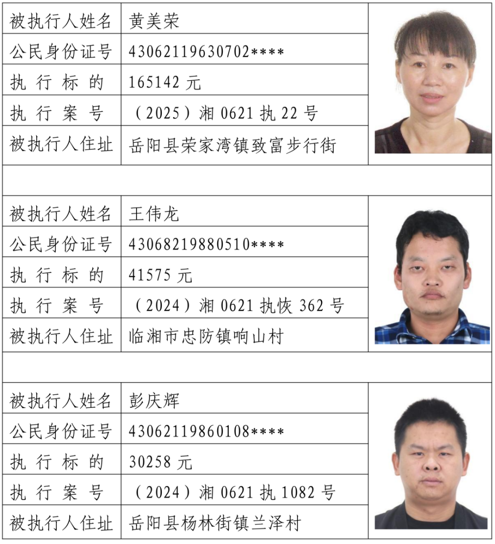 为敦促被执行人自觉履行生效法律文书确定的义务,努力推进社会诚信建设。根据《中华人民共和国民事诉讼法》《最高人民法院关于公布失信被执行人名单信息的若干规定》等相关法律和规定,本院决定对下列失信被执行人信息予以曝光。曝光人员应立即履行生效法律文书确定的义务,否则将视情节采取罚款、拘留等强制措施,对拒不履行、抗拒执行、规避执行的被执行人将依法追究刑事责任。【备注:下述失信被执行人名单信息仅代表本次曝光时段情况,实时失信被执行人信息以最高院网站查询结果为准。欢迎广大人民群众对已曝光被执行人行踪及财产线索进行举报。举报电话:0730-7668833。】