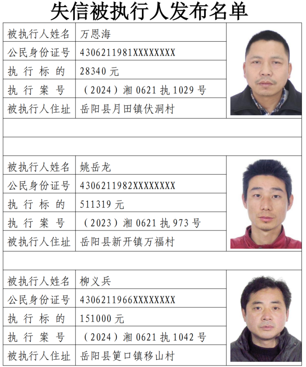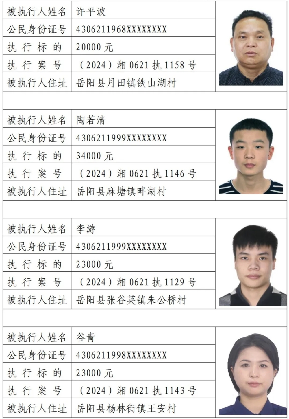 为敦促被执行人自觉履行生效法律文书确定的义务,努力推进社会诚信建设。根据《中华人民共和国民事诉讼法》《最高人民法院关于公布失信被执行人名单信息的若干规定》等相关法律和规定,本院决定对下列失信被执行人信息予以曝光。曝光人员应立即履行生效法律文书确定的义务,否则将视情节采取罚款、拘留等强制措施,对拒不履行、抗拒执行、规避执行的被执行人将依法追究刑事责任。【备注:下述失信被执行人名单信息仅代表本次曝光时段情况,实时失信被执行人信息以最高院网站查询结果为准。欢迎广大人民群众对已曝光被执行人行踪及财产线索进行举报。举报电话:0730-7668833。】