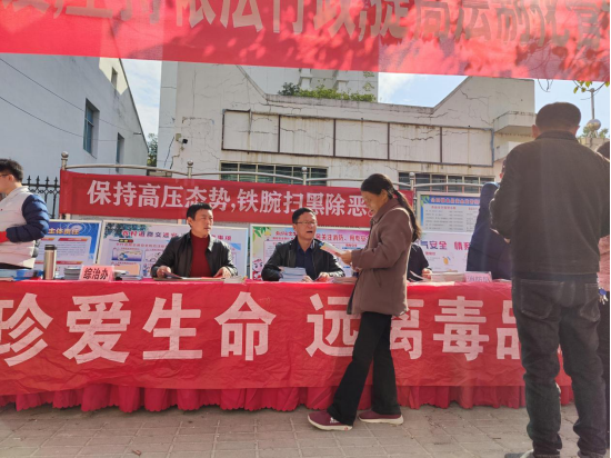 此次活动地点选在人流量较大的公田镇老街公田法庭附近,通过拉横幅、发资料、看展板、讲法规等多种形式让群众能够听懂、学会、用好相关的法律知识,同时还有司法所法治专干以及禁毒办禁毒专干给群众科普民法典知识和禁毒方面相关法律知识,鼓励群众积极参与到禁毒人民战争当中来,学会用法律武器来保护自己。