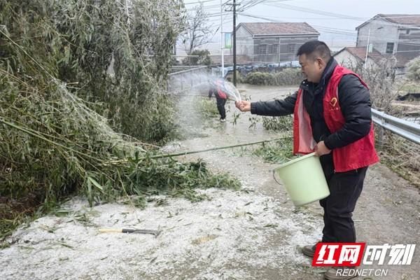 受极端冰雪天气的影响,像风水村这样的情况还不在少数,尤其是在偏远的毛田、月田、张谷英等林木资源丰富的地区,残枝断木、道路结冰更为普遍,已经严重影响了群众出行安全。岳阳县各驻村工作队不讲价钱、不找借口,迅速赶赴一线开展工作。毛田镇西台村驻村队员一同砍树;筻口镇明星村驻村队员组织党员干部撒盐;公田镇飞云村驻村队员齐心铲雪;驻村工作队通过微信群同其他工作队交流心得、传授经验……那一声声充满干劲的口号,那一个个充满力量的身影,温暖的是群众的心,鼓舞的是干部的劲。