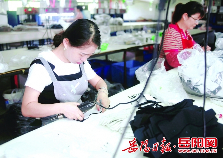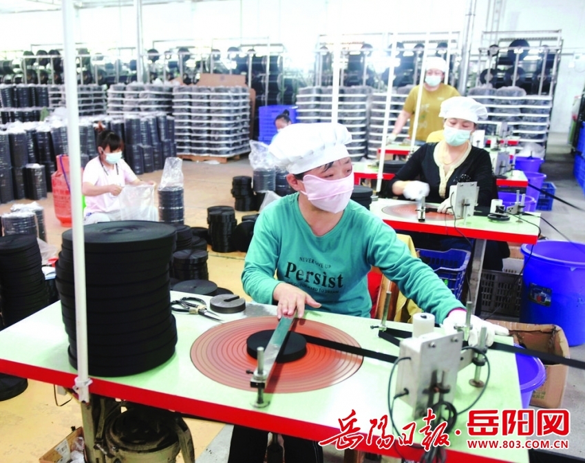 走进岳阳县新开镇兴胜鞋材加工车间内,只见45名员工熟练地操作着裁断机、高周波熔接机等机器设备,现场轰鸣声此起彼伏,热火朝天的生产场景映入眼帘。
