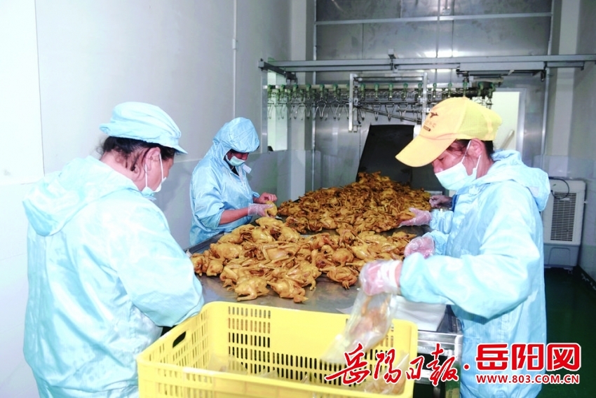 在位于杨林街镇程山舟村的湖南友聚食品有限公司深加工车间内,一股浓郁的乳鸽香味扑鼻而来,只见一只只色泽金黄的乳鸽在流水线上游走,工人们正忙着分拣、装袋、封口、打包。