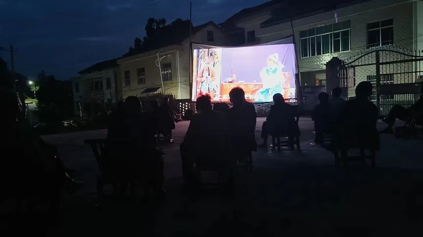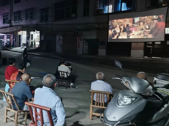 夜幕降临,在西台村村部及各片组的村民聚集地,随处可见,一块幕布,一对音箱,一台放映机,搭建的临时影院。在电影放映前,播放了森林防火,交通安全,防溺水等短视频,旨在提高村民的安全防范意识。在正式放映活动中,先后放映了群众喜爱的花鼓戏,红色电影《百团大战》多部经典影片,村民们边看电影边讨论电影情节,沉浸在电影剧情中。