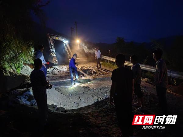 5月30日晚,岳阳县月田镇相思山村工作队和村两委抢修公路。