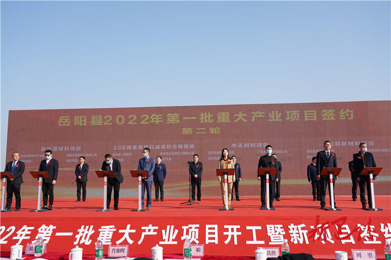 岳阳县融媒体中心3月2日讯(记者 熊佳 钟斯洋)春暖万物苏,扬帆正当时。3月2日,我县举行2022年第一批重大产业项目开工暨新项目签约仪式。县委书记肖湘晖出席开工仪式并宣布2022年第一批重大产业项目正式开工,县委副书记、县长吴光文出席并致辞,开工仪式由县委副书记、政法委书记、岳阳高新技术产业园区管委会第一书记姜其胜主持,县领导周峰、周里、王靖、张文毅、李樱、余望新和集中开工暨新签约项目业主、施工单位代表等出席开工仪式。