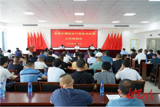 岳阳县融媒体中心4月26日讯(记者 熊佳 付琴)4月26日,全县乡镇综合行政执法改革工作现场会在公田镇召开。县委书记肖湘晖强调,要坚定信心决心、强化责任担当,确保各项改革工作顺利推进、落地见效,为争当岳阳省域副中心城市建设排头兵作出新的更大贡献。县委常委、组织部长冯建军主持会议,县委常委、副县长贺立,县执法改革工作领导小组成员单位主要负责人、县直委托乡镇执法的相关部门和执法大队负责人、各乡镇(办事处)党工委书记、分管副职、执法大队长等参加。