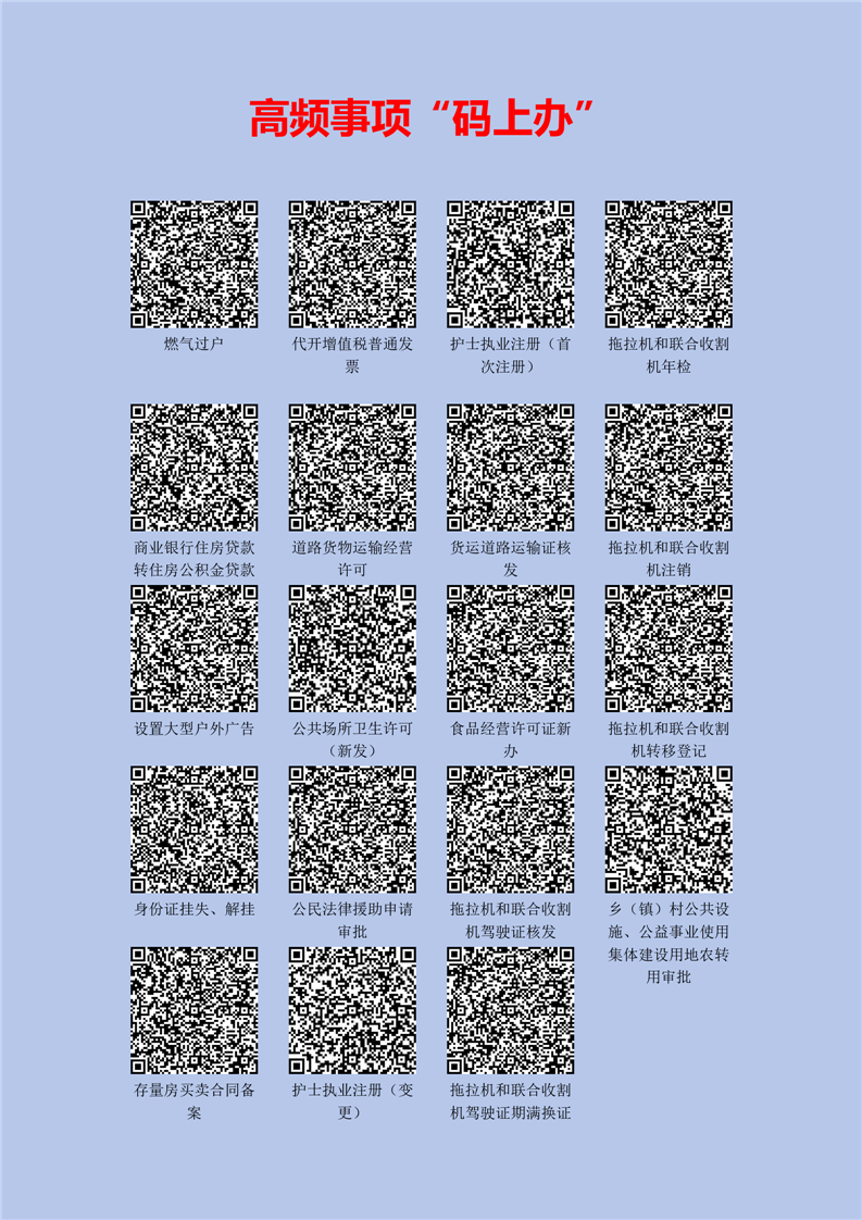 目前已梳理了人社、民政、市监、公安、交通、卫健等42个高频服务事项,办事群众只需通过手机扫描办理事项“二维码”,即可“码”上获知办理事项的受理时限、申请材料、办理流程等信息,避免了办事群众因材料不全而多次往返、也弥补了纸质办事指南内容更新不及时、不易携带、不便于查找的缺陷,将“手机”变为“自助机”,真正实现“指尖办”“码上办”!